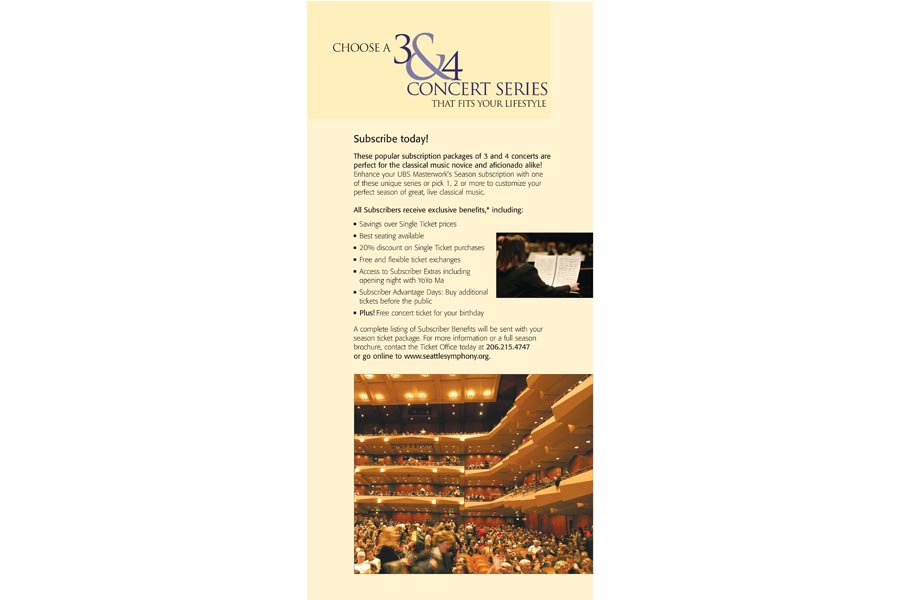 Interim Creative Director for the Seattle Symphony. Design and photo art direction of Seattle Symphony Program Guide. Focusing on the concept of the overall experience of the Symphony. “Experience the energy”: the energy of the music, of being in the city, the overall experience of coming to the Symphony. We pulled this into the art direction of the blurred-motion photography and bold use of type and color in the design.